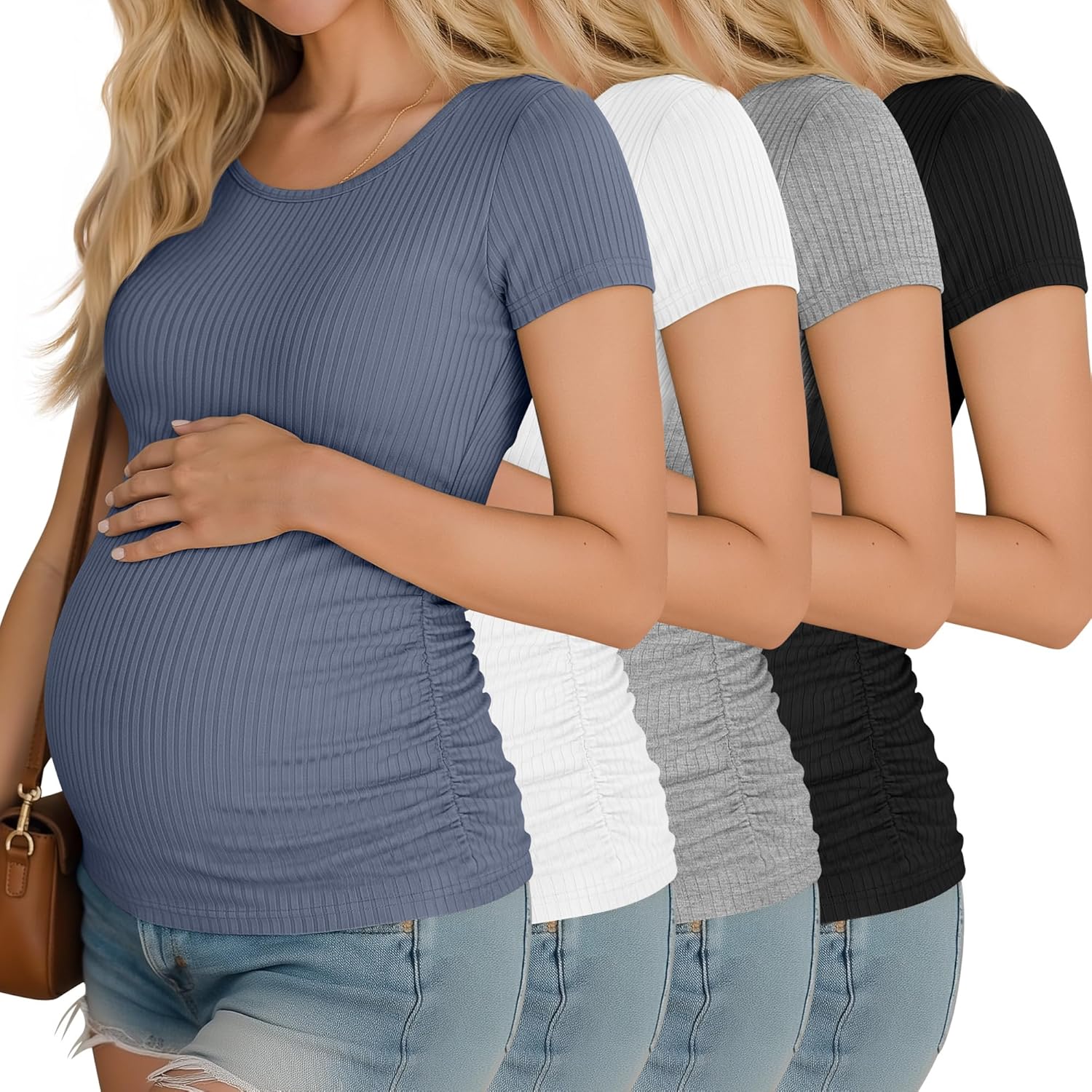 Riyiper 4 Pack Women's Maternity T-Shirts, Cotton Side Ruched Ribbed Maternity Top Scoop Neck Short Sleeve Pregnant Clothes