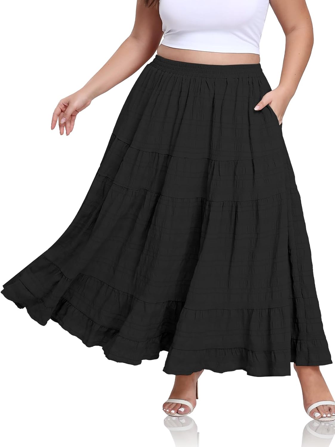 Women's Plus Size Maxi Skirt Layered Tiered Long Skirts High Waisted A Line Flowy Maxi Skirt with Pockets