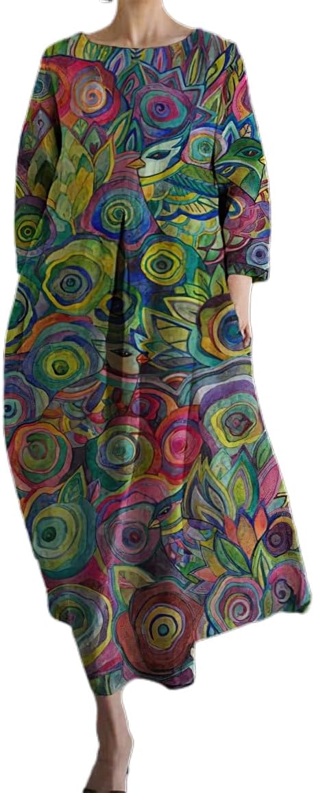 Akivide Women's Flowy Oversized Baggy Boho Floral Print Crewneck Long Sleeve Cotton Maxi Dress Loose Dress