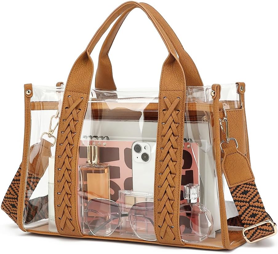 FAIME Clear Tote Bag for Women Stadium Approved Woven Crossbody Handbag Clear Purse for Stadium Events, Concert, Work & Beach