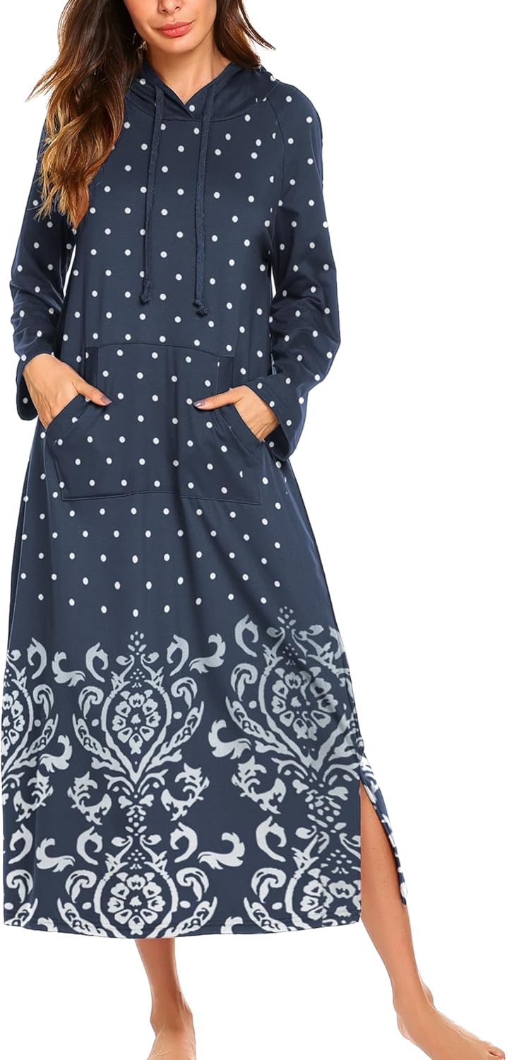 Ekouaer Sleepwear Women Long Sleeve Hooded Nightgown Contrast Color Full Length Loungewear with Pocket