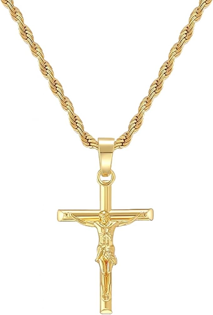 18K Gold Plated Cross Pendant with 3mm 22" Rope Chain for Men Catholic Jesus Cross Pendant