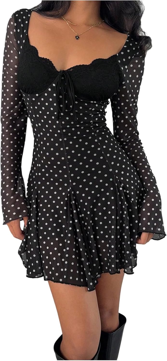 Verdusa Women's Rave Polka Dots Lace Tie Knot Mini Dress Mesh Flare Sleeve Flowy Dresses Party Outfits