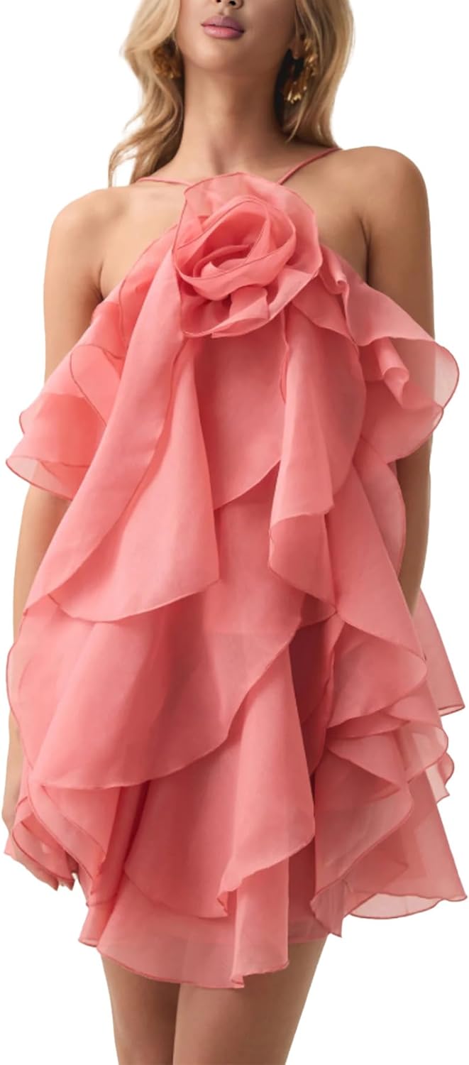 Women's Floral Dress Sexy Halter Ruffle Sleeveless Tiered Dress Elegant Party Dresses Clubwear