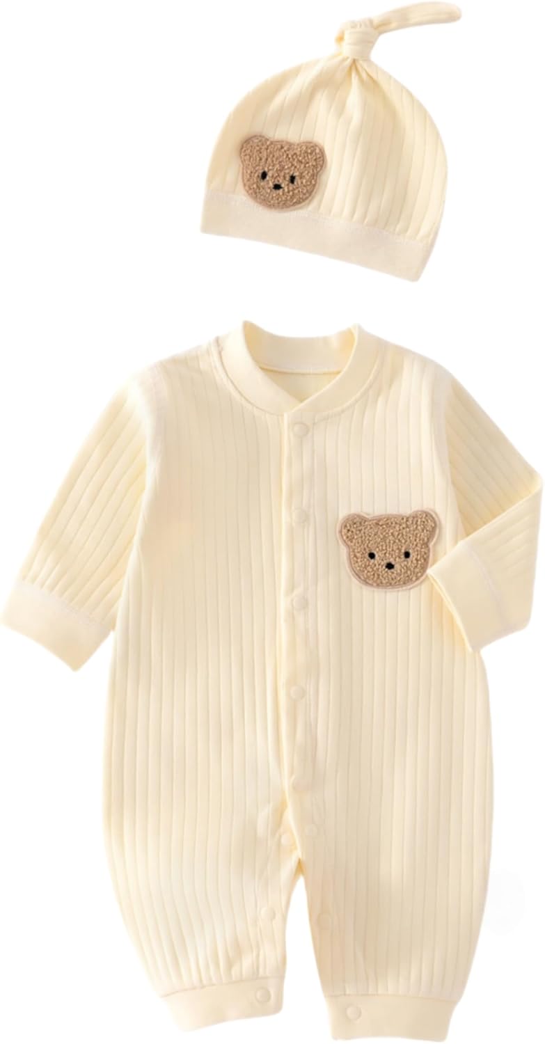 Baby Boys Girls Clothes with Hat, 100% Cotton Long Sleeve Ribbed Knit Button Infant Baby Romper Outfit