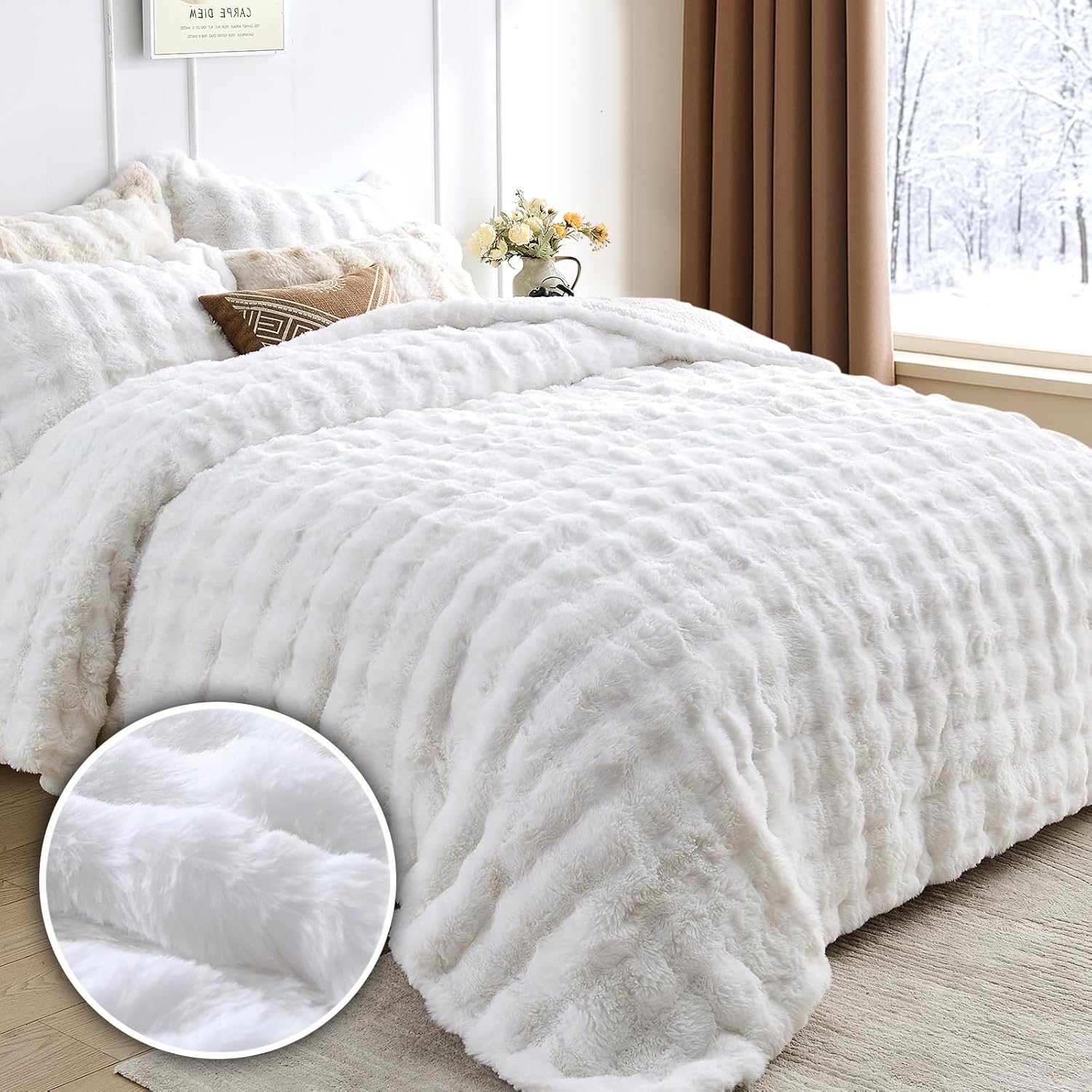 - Care Instruction:The faux rabbit fur comforter can be gently machine washed in cold water and dried naturally. Do not bleach or iron.Before use, gently shake the comforter to allow the fur to fluff up naturally,making it last longer.The set is vacuum-packed,After opening,let it rest for 48 hours to restore it to its original state