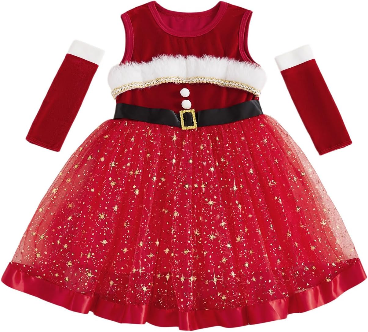 Kids Toddler Baby Girl Christmas Outfit Santa Claus Dress Velvet Stars Sleeveless Tulle Dress Oversleeves Clothes