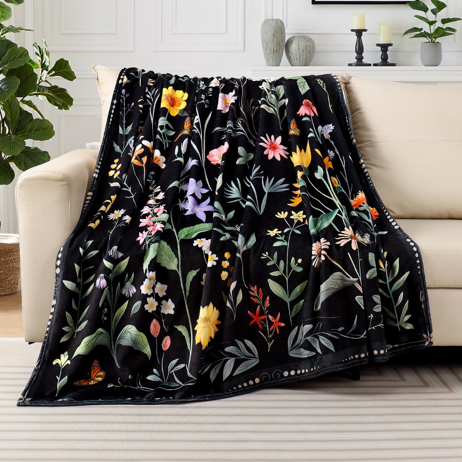 Spring Flowers Throw Blanket Black Vintage Floral Blankets Soft Cozy Flannel Fleece Plants Butterfly Print Bed Blankets for Bedding Sofa and Travel Camping 50" × 60"