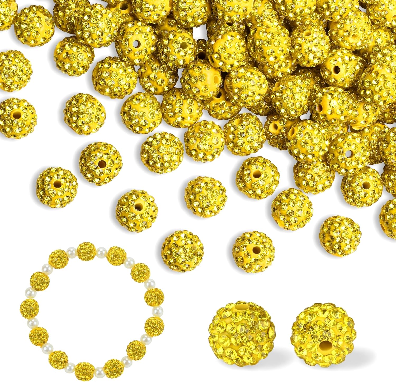 - Rhinestone Inlay: Each yellow bead is made of high-quality rhinestones and clay, shining and dazzling. The surface of the beads is inlaid with evenly cut rhinestones, making these beads shine and round like disco balls. It is a suitable material for your DIY.