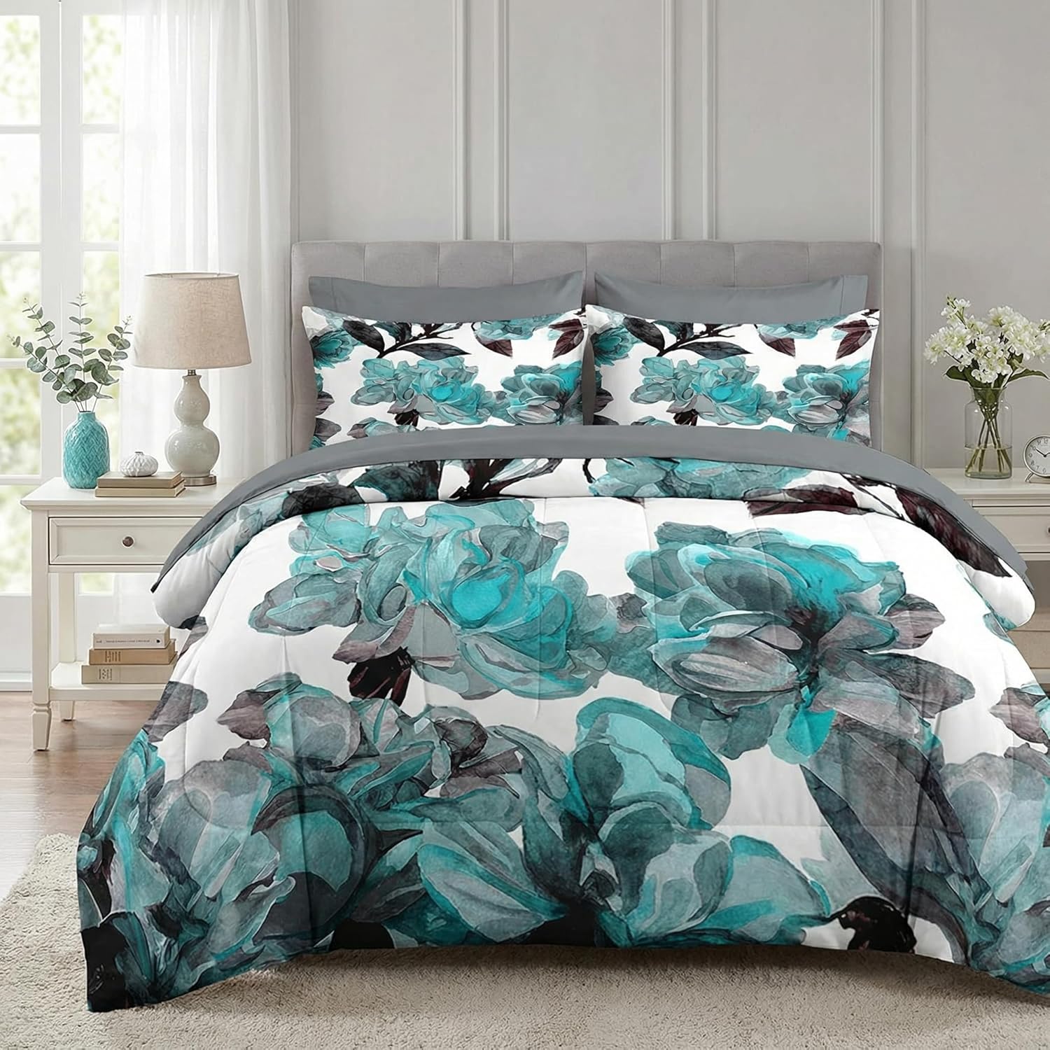 Nesker Comforter Set Queen Size, Teal Turquoise Flower 7 Pcs Bedding for Kids and Adults, Ink Floral Roses Bed Sheet Sets with Fitted Sheet 2 Pillowcases & 2 Shams