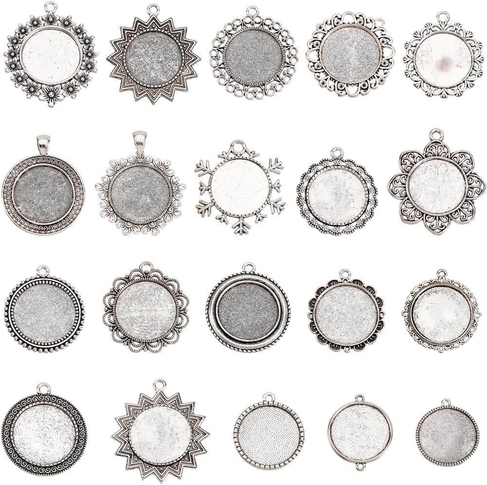 SUNNYCLUE 1 Box 20Pcs 25mm Blank Bezel Pendant Trays Round Bezel Pendant Trays Antique Silver Metal Flower Base Cabochons Settings Charms for Jewelry Making Photo Findings Necklace DIY Craftings
