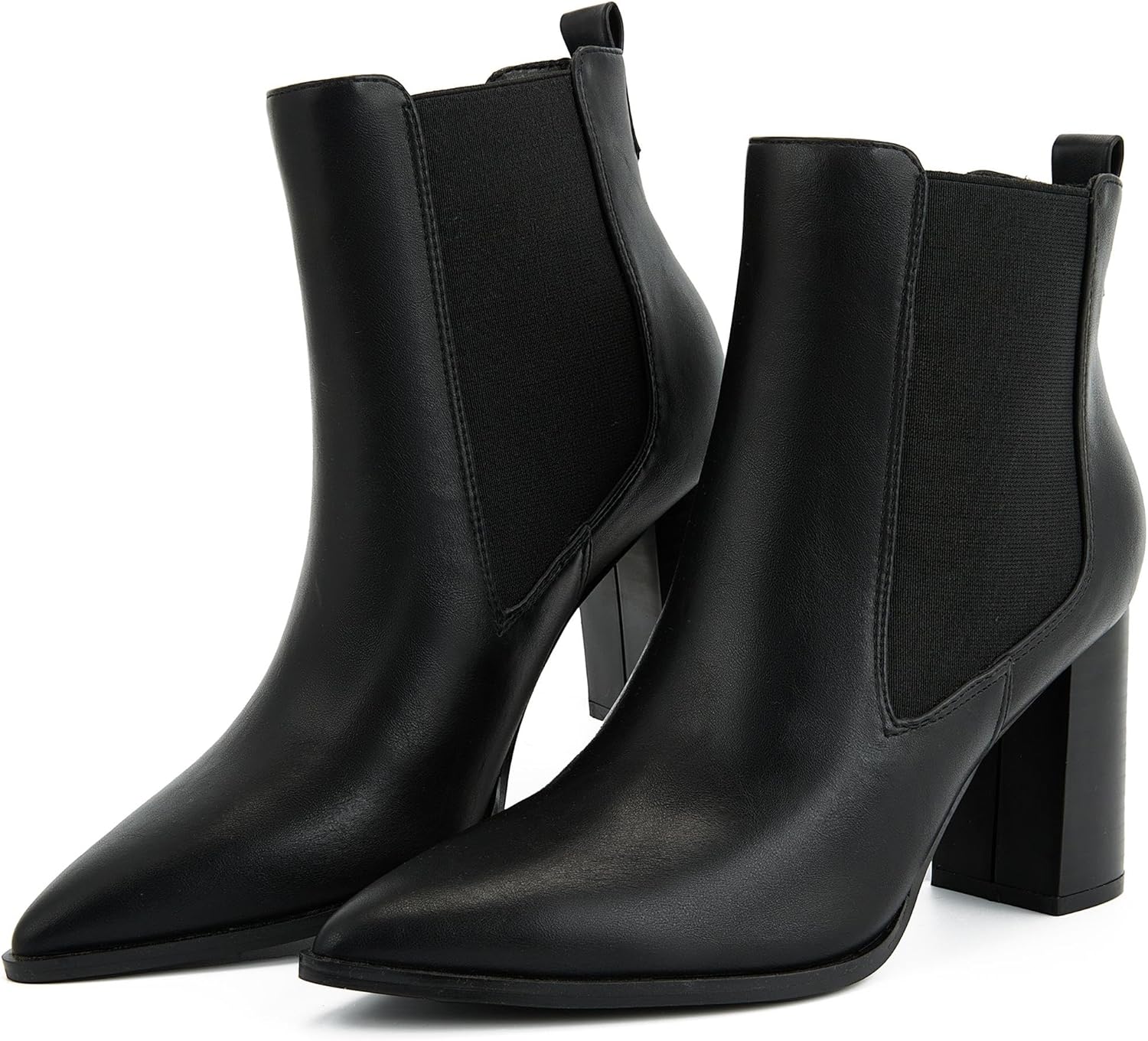 Putu Women's Pointed Toe Ankle Boots Chunky Heel Chelsea Boots Pull on Heeled Booties with Elastic Gore