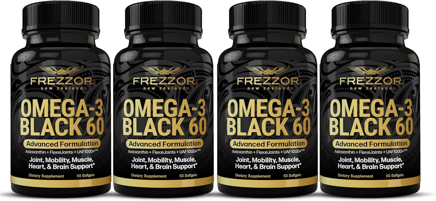 FREZZOR Omega 3 Black - Highest Strength Green Lipped Mussel Oil Capsules, Made in New Zealand, UAF1000+, Inflammation, Joint Care & Relief, Heart & Immune Support, 60 Count (Pack of 4)
