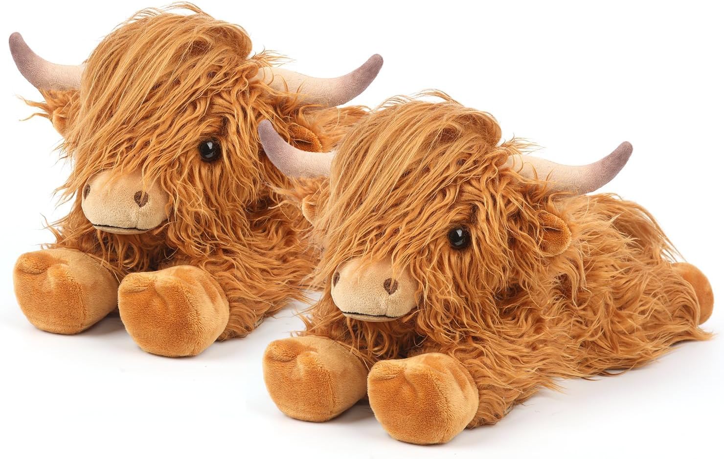 - 2Pcs LIFELIKE HIGHLAND COW APPEARANCE: This highland cow stuffed animal plush is a designer original! This highland cow plush is approx: 15"L x 8"W x 7"H in size. This sweet buddy is irresistibly soft, featuring shaggy fur, an endearing facial expression. A unique and delightful gift for any cow lover