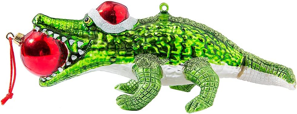 - 【Unique Hand Crafted Hand Blown Glass Christmas Ornaments】: The beautiful alligator ornaments for Christmas tree are hand painted and glittered to deliver glistening looking on trees in winter holidays. Made of glass and resin.