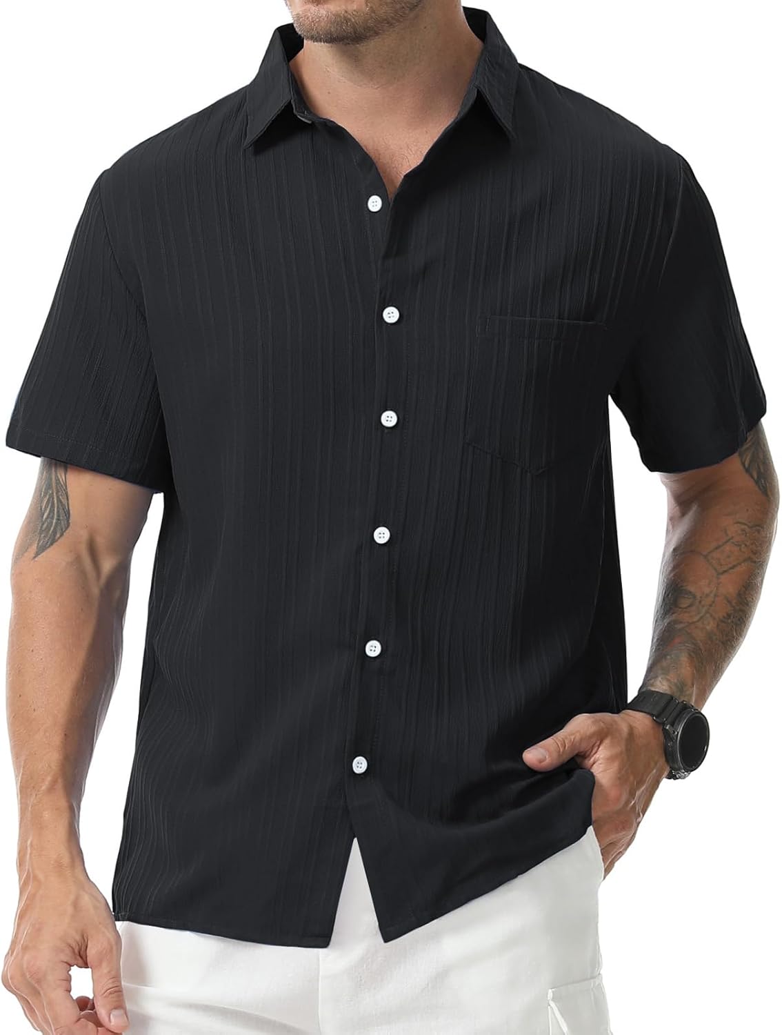 Mens Casual Short Sleeve Shirt Relaxed Button Down Summer Vacation Beach Textured Lightweight Wrinkle Free Shirt
