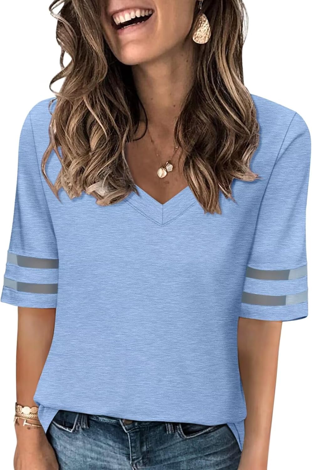 Women's V Neck T Shirts Mesh Panel Short Sleeve Tops Casual Summer Tees
