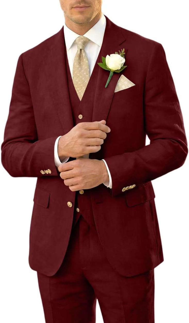 3 Piece Linen Suit for Men Retro Slim Fit Summer Beach Wedding Groom Prom Mens Suits Tuxdo Blazer Jacket Vest Pant