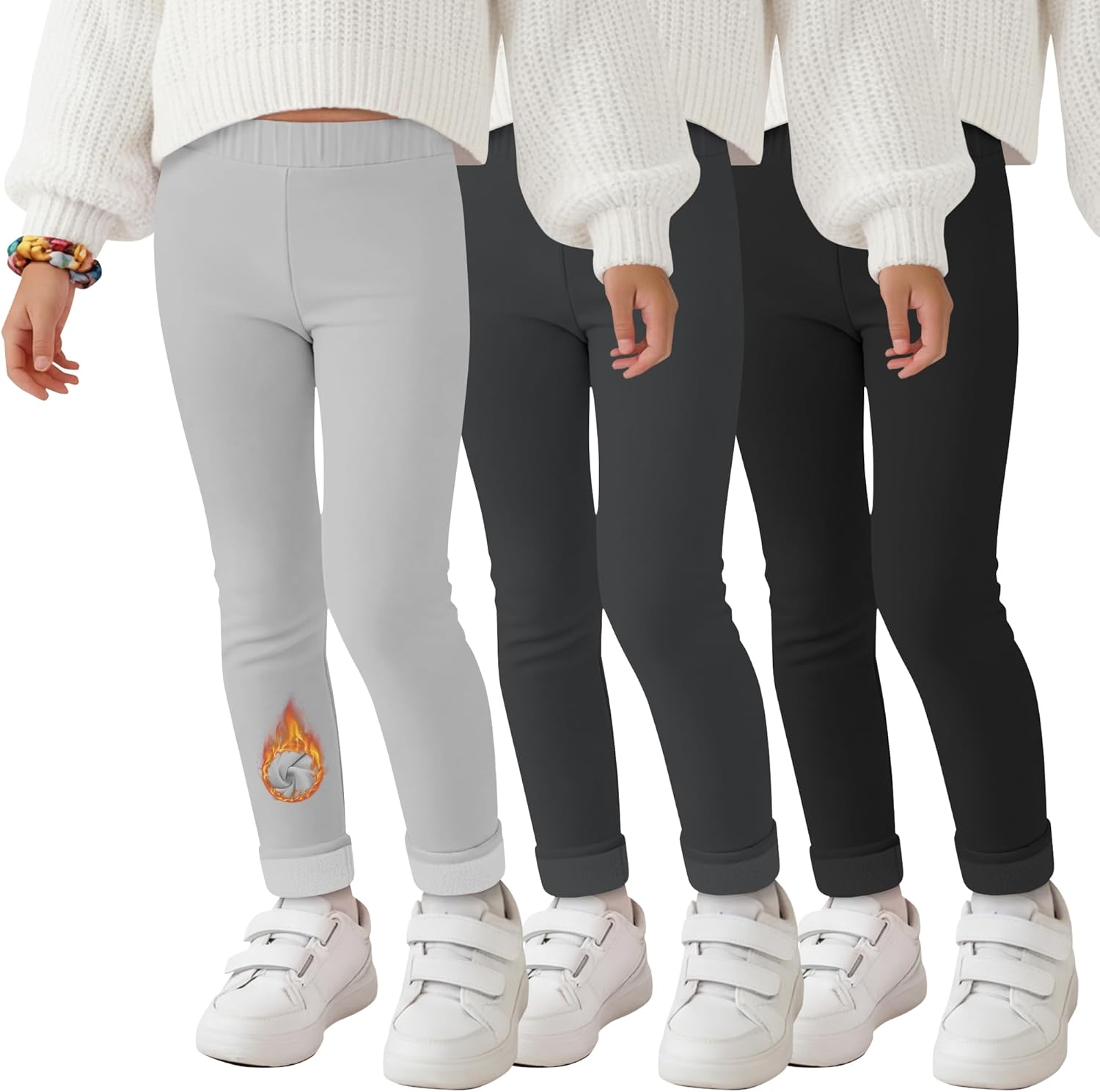 3 Pack Girls' Fleece Lined Leggings, Winter Thermal Pants Tight Stretchy Full Length Pants for Kids Aged 3-11