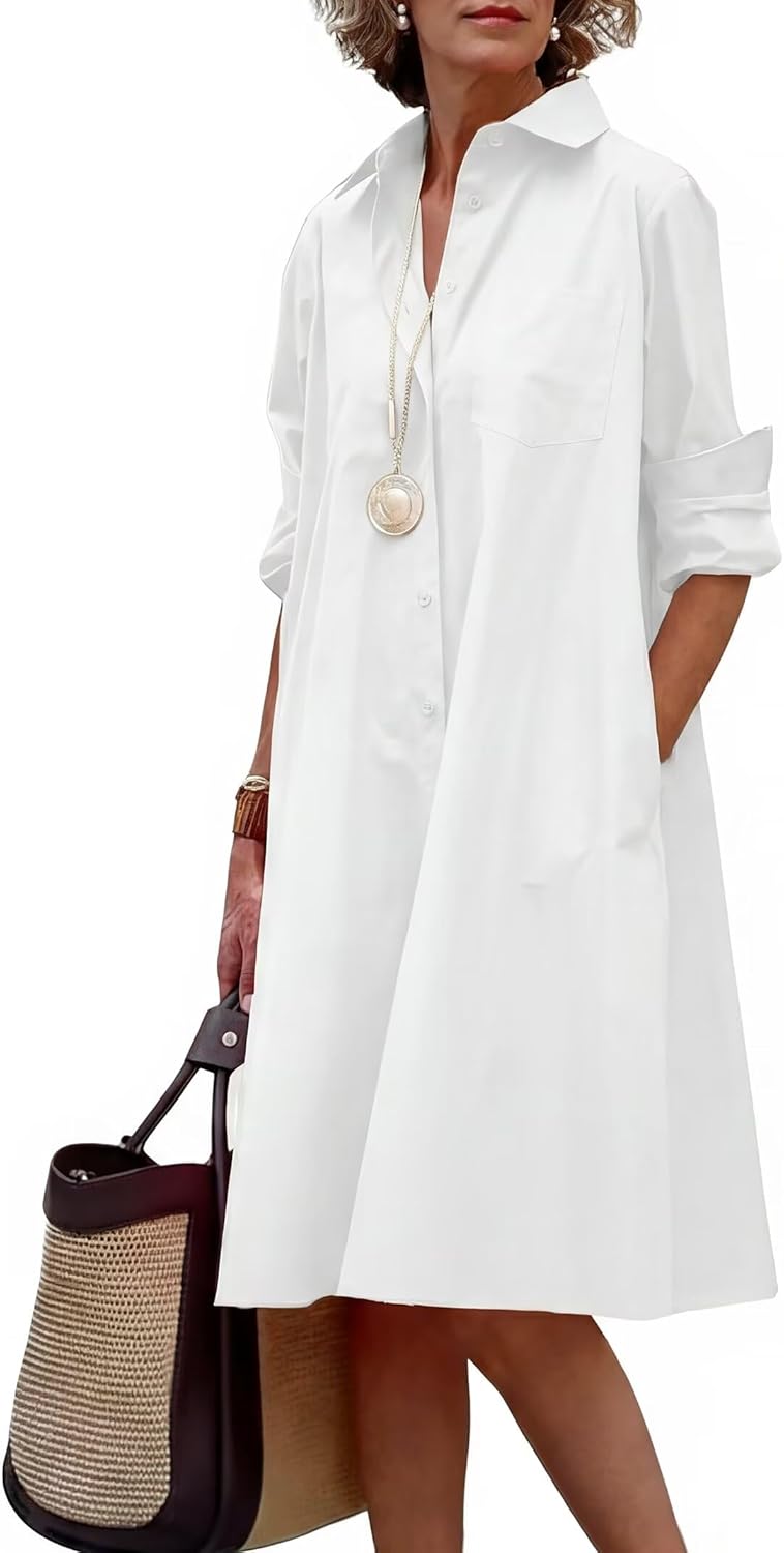 Choichic Shirt Dresses for Women Casual Long Sleeve Button Down Shirts A-Line Midi Shift Tunic Dress with Pockets