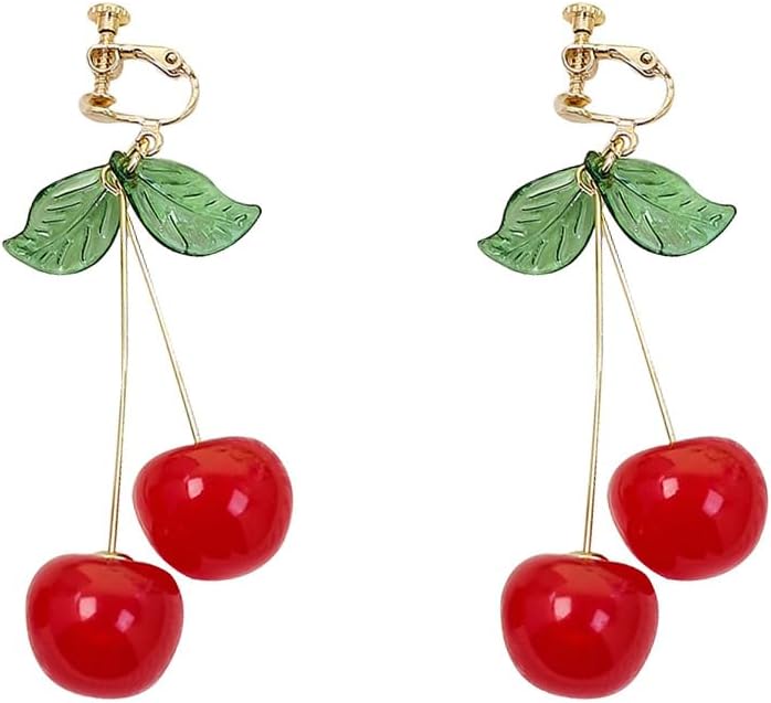 Cute Cherry Clip On Fruit Dangle Earrings for Women Hypoallergenic Funny Sweet 3D Red Cherry Green Leaf Ear Clips Dangling Drop Acrylic Lightweight Lovely Creative No Piercing Ears Jewelry Daughter
