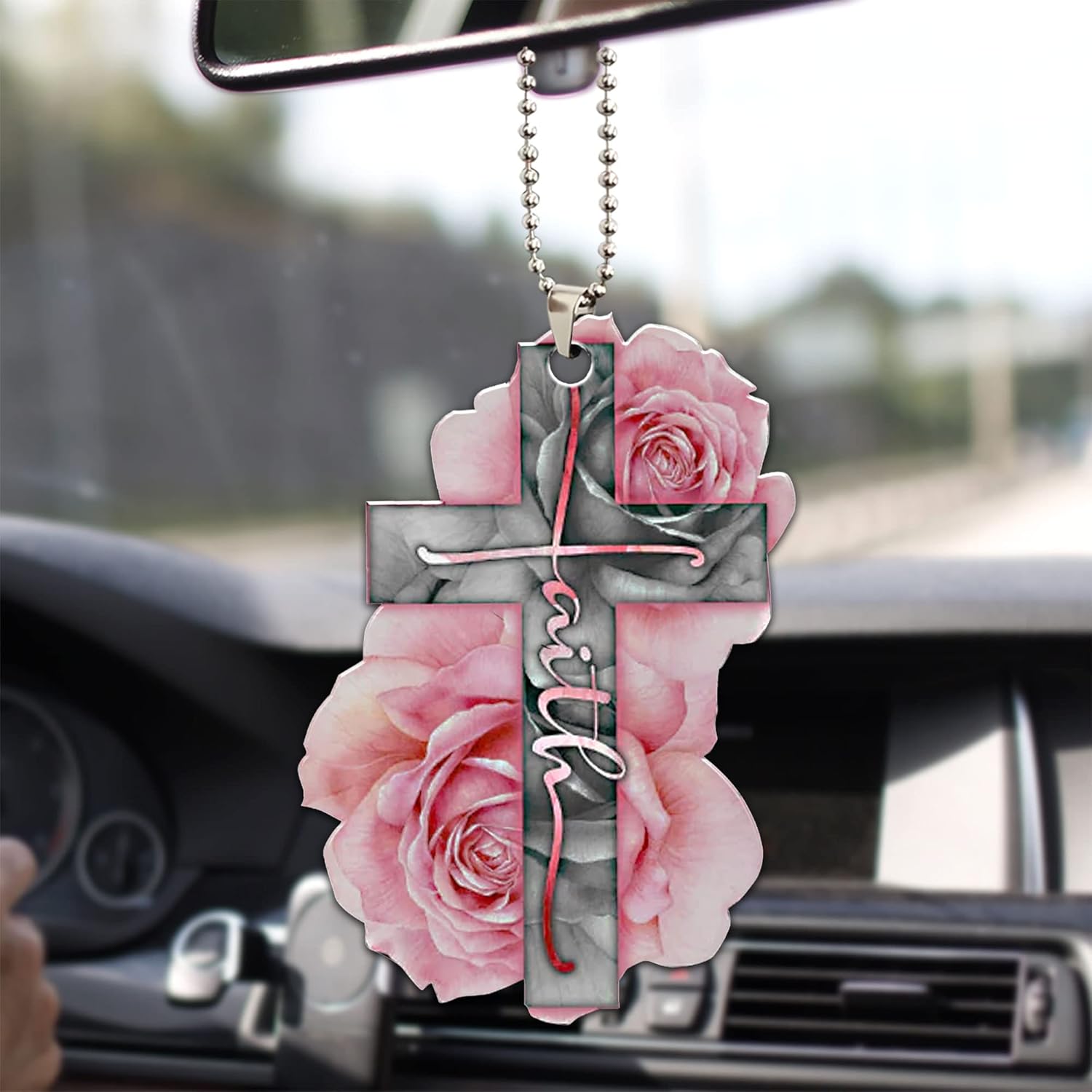 Talataca Pink Cross Rose Rosy God Faith Christian Jesus 2D Flat Car Rear View Mirror Accessories Christmas Tree Ornament Decoration Hanging Charm Interior Rearview Pendant Decor Gift