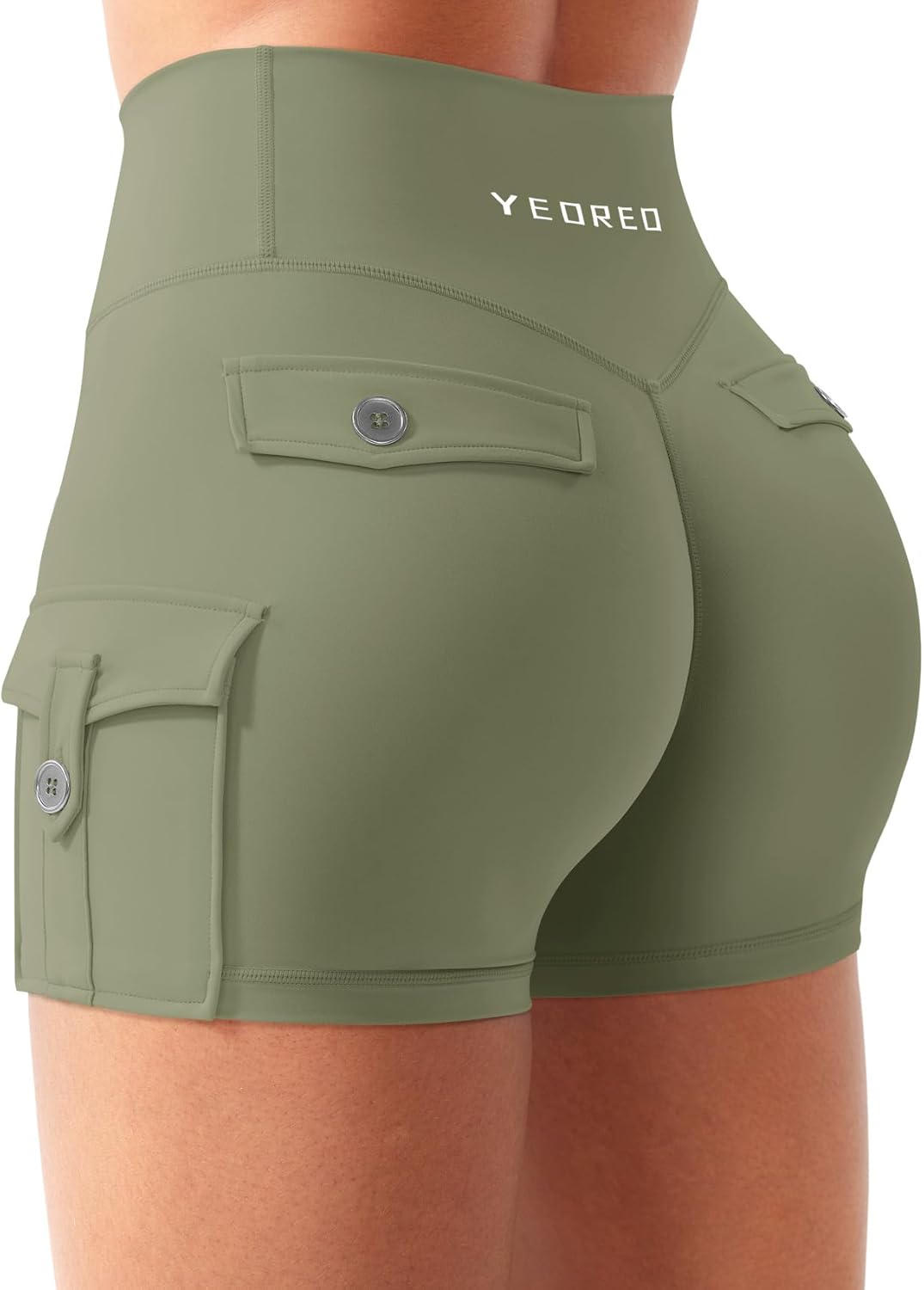 YEOREO CoreFlex Women Workout Gym Shorts with Cargo Pockets Hidden Scrunch 3.6" 4.5" Inseam No Front Seam Biker Shorts