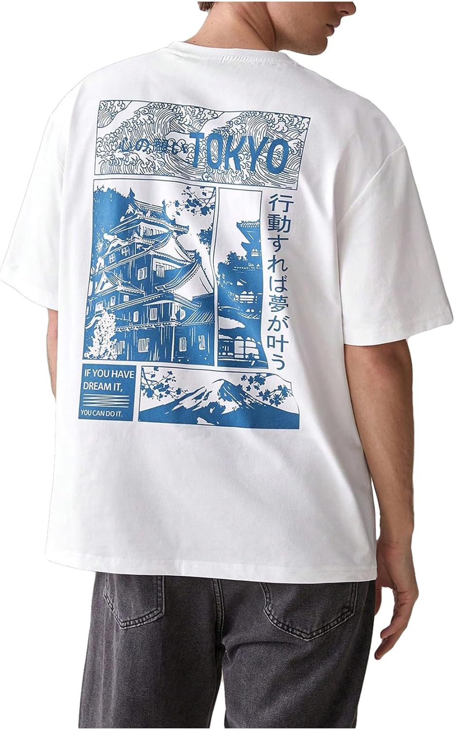 GORGLITTER Men's Japanese Letter Graphic Tee Top Oversized Short Sleeve Casual Aesthetic Print T-Shirt