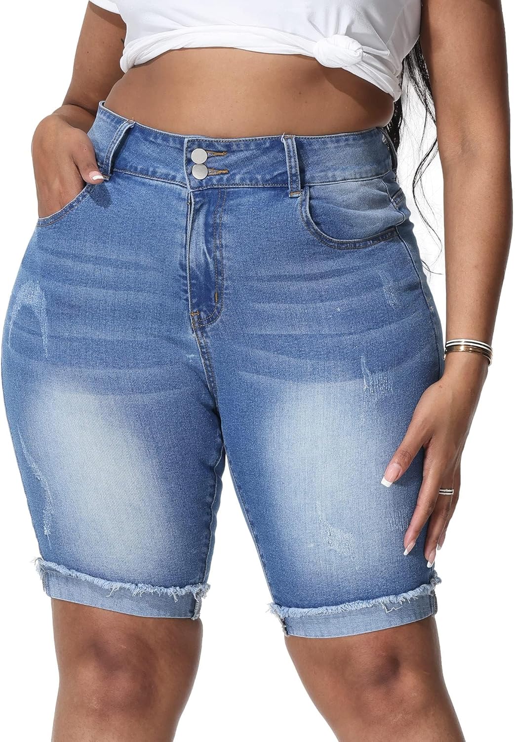 Womens Plus Size Jean Shorts Stretchy High Waisted Ripped Roll Hem Denim Bermuda Shorts 10" Inseam