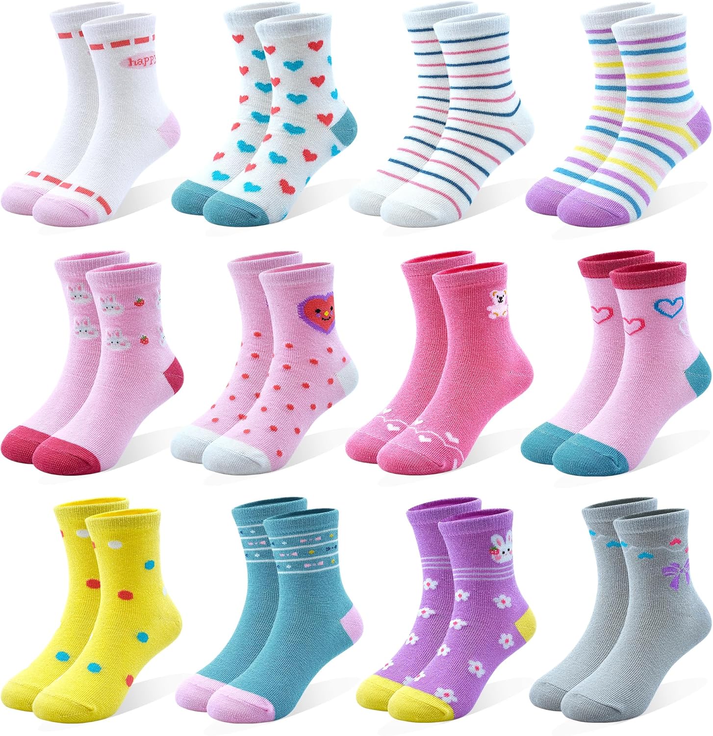 12 Pairs Girls Socks for Kids Crew Socks Cotton Cartoon Novelty Crazy for Toddler 1-7 Years Old
