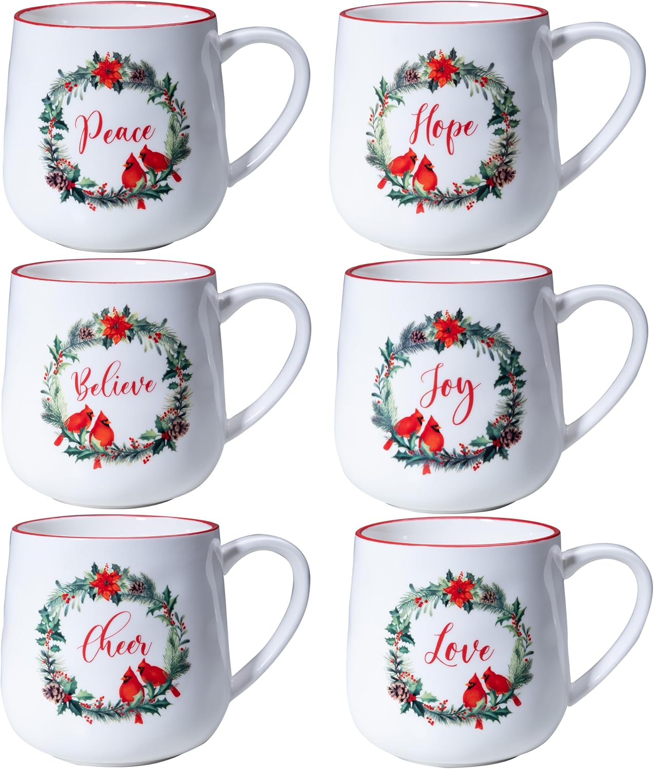 Christmas Ceramic Coffee Mug Set of 6, 16 OZ Holiday Porcelain Mugs, Wreath with Red Cardinal design With words Hope,Peace, Cheer, Joy, Love, Believe Cups for Xmas Gift Party Supplies