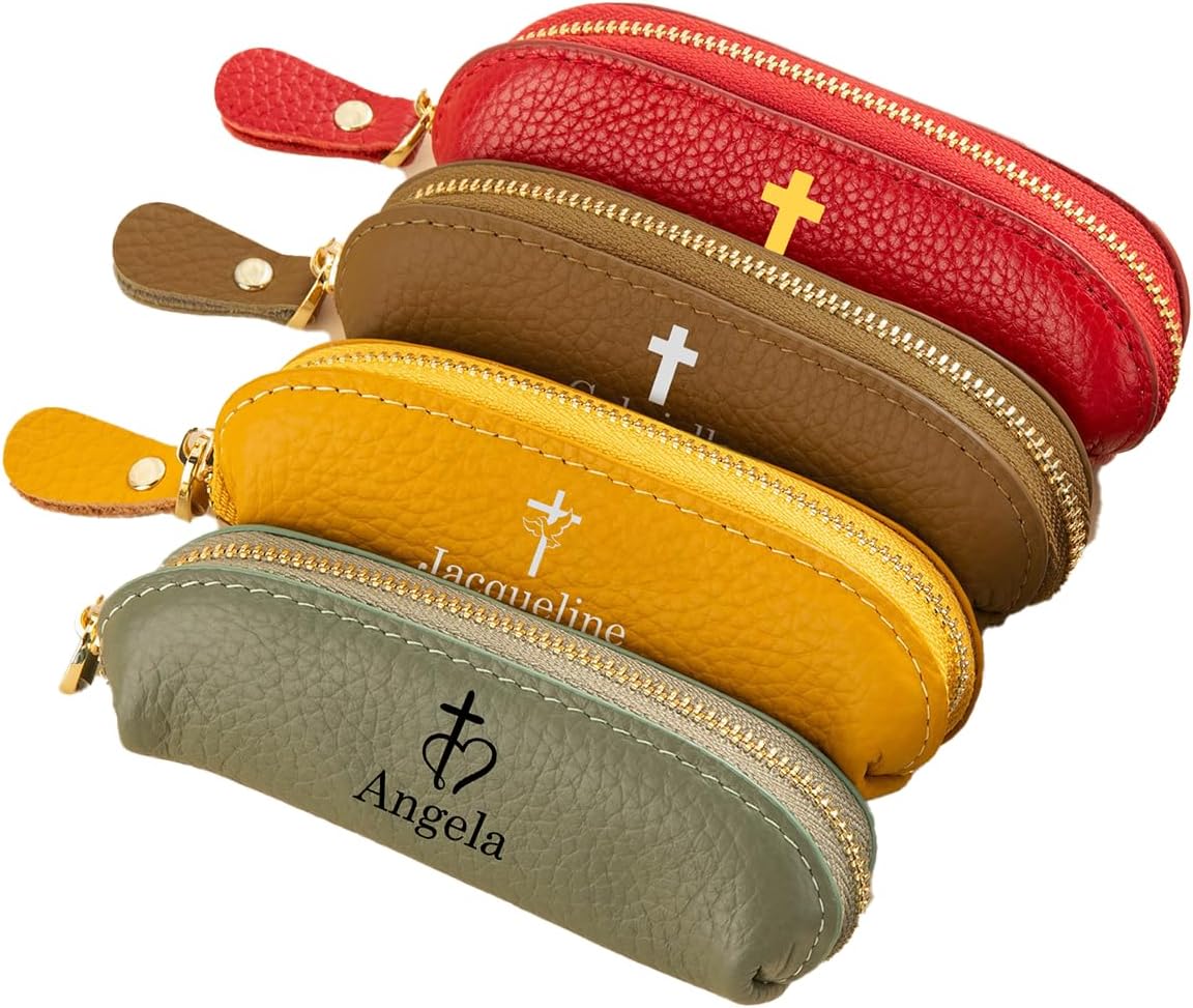 Personalized Rosary Pouch with Zipper – Catholic Prayer Bead Holder for Travel | Custom Name & Cross Design Leather Case for Men & Women