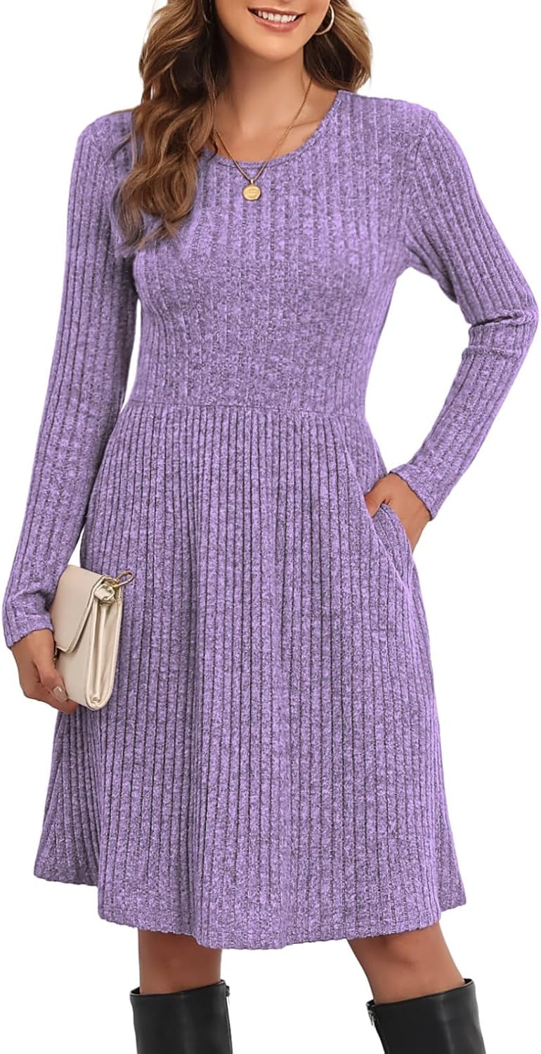 Women's Knit Textured Sweater Dresses Long Sleeve Loose Casual Pleated Fall Dress with Pockets,Purple, 3XL