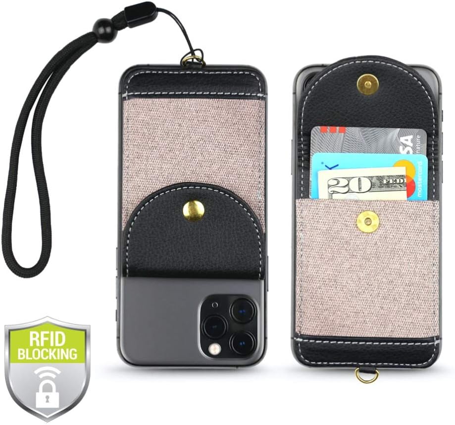 Cell Phone Wallet for Back of Phone with Wrist Strap, Stick On Wallet Credit Card ID Holder with RFID Protection Compatible with iPhone, Galaxy & Most Smartphones and Cases