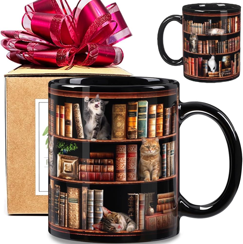 Cat Book Coffee Mug Gifts for Book Lovers, Bookish Mug Gifts for Readers, Library Bookshelf Cup, Cat Lovers Black Mugs 11oz
