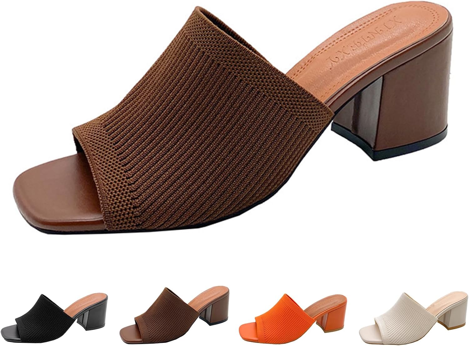 Women's Knit Peep Toe Chunky Heeled Sandals Fashion Square Open Toe Slip On Block Heel Mules Summer Casual Breathable Slides Sandal