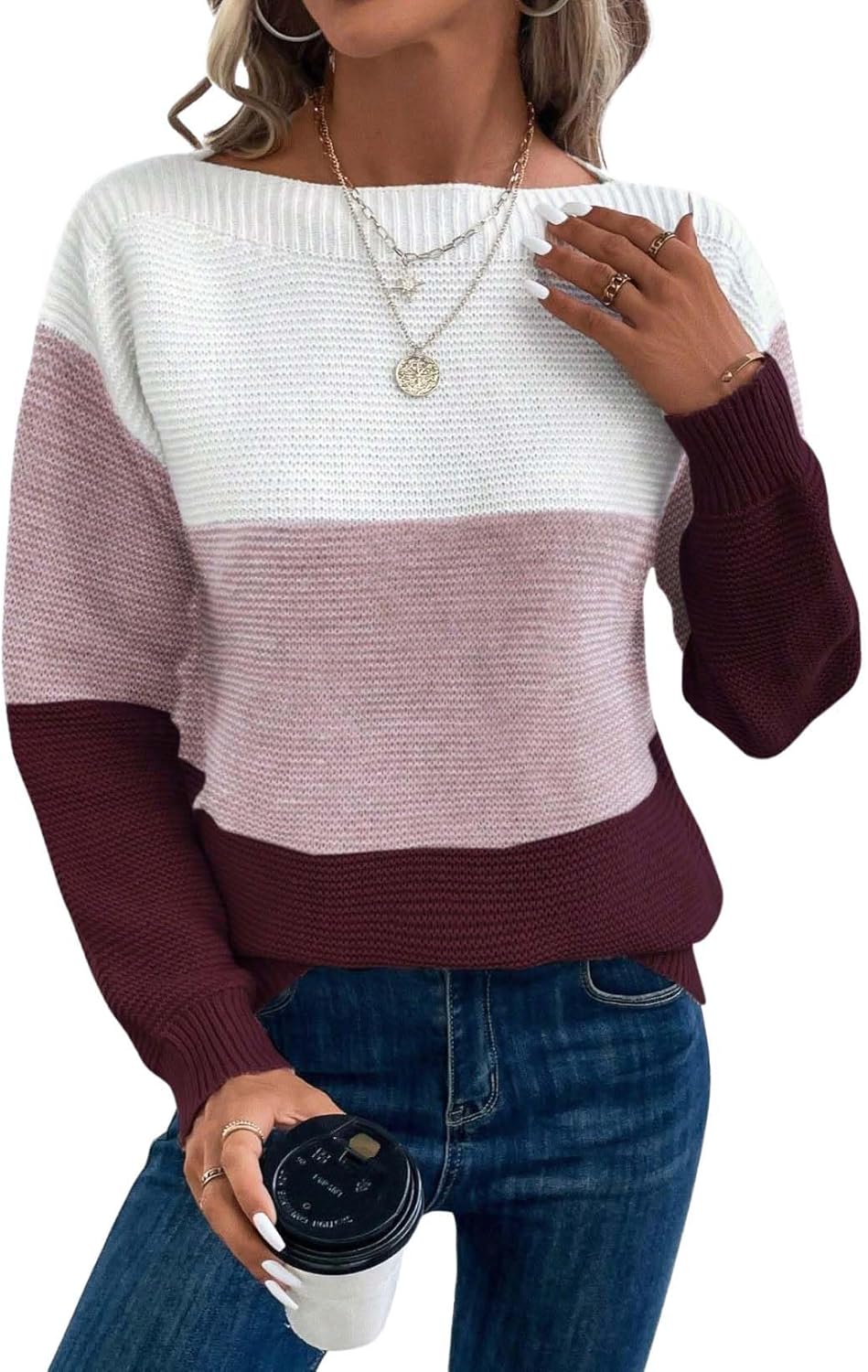 LIZALIG Women's Striped Color Block Sweater Long Sleeve Crewneck Casual Loose Fit Soft Knit Sweater Pullover Tops
