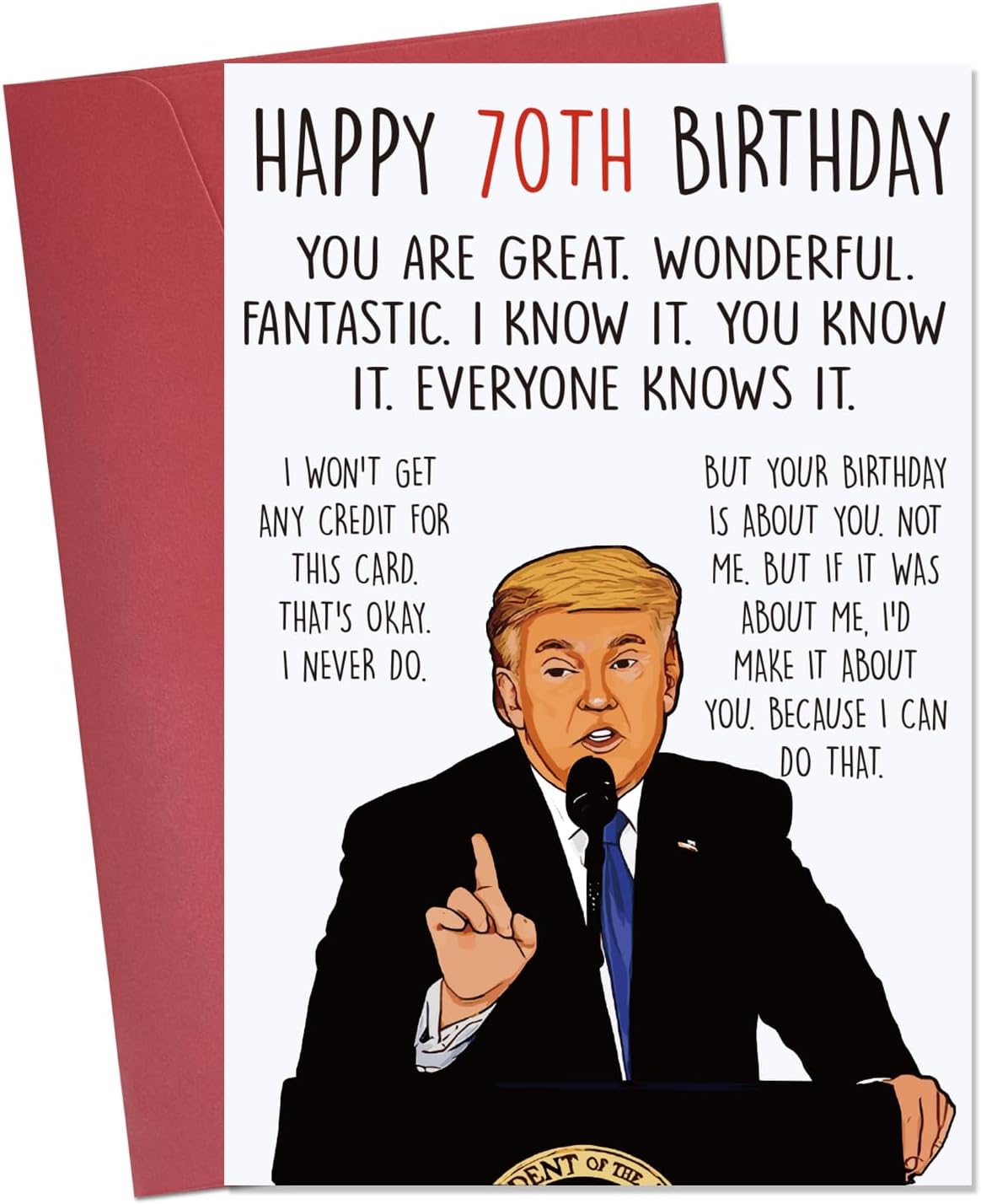 - 【Humorous 70th Birthday Card】The 70th birthday card’s text is delivered in a humorous and self-praising tone, such as "I WON’T GET ANY CREDIT FOR THIS CARD. THAT’S OKAY. I NEVER DO." This witty approach instantly brightens the birthday atmosphere, allowing the recipient to feel blessed amid laughter with a trump birthday card. It’s a great 70th birthday gifts for men option that brings smiles and joy.