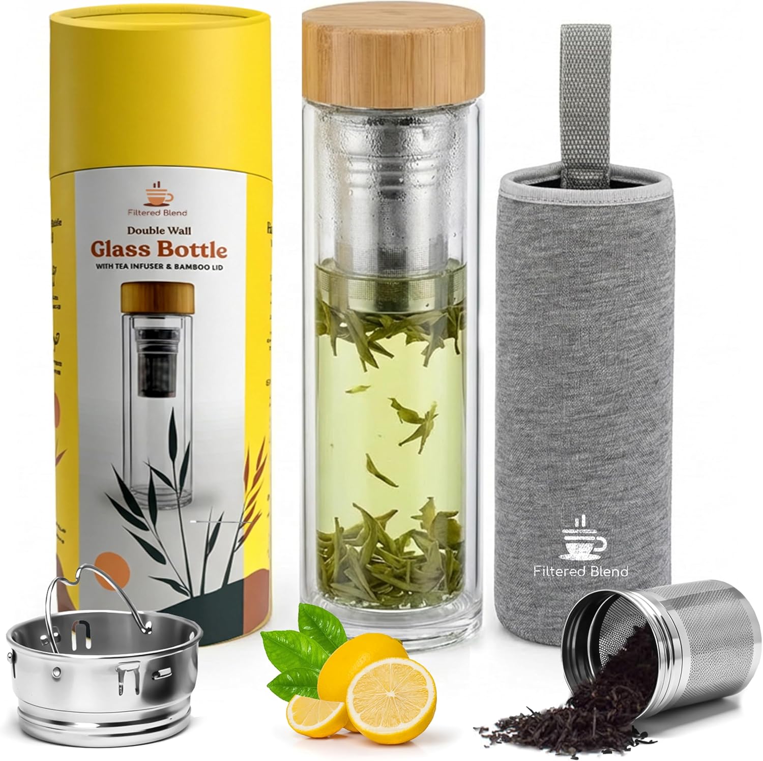 Bamboo Lid, Double Wall Bottle Glass, Dual 304 Stainless Steel Strainer, Non-slip Sleeves