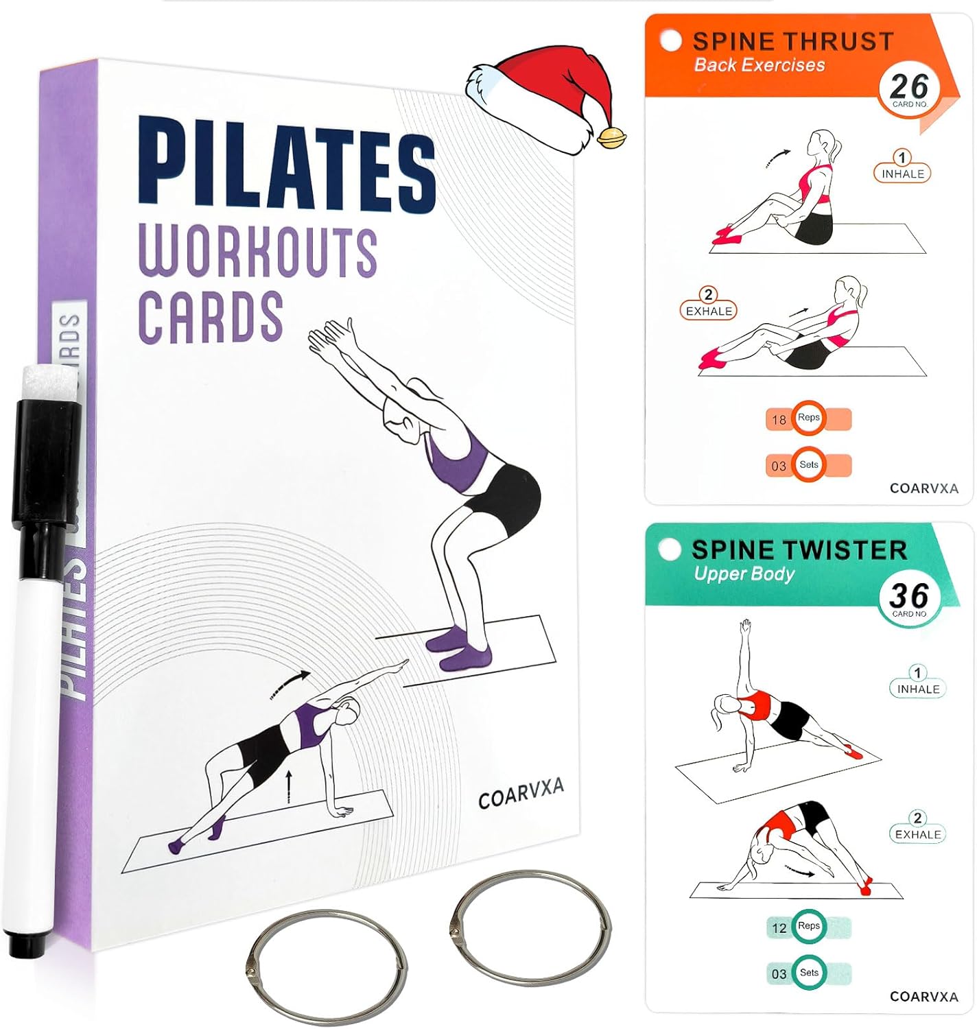 Pilates Workouts for Women-58 Exercise Cards with Pilates Mat Workout Postures,Includes 4-Week Challenge,2 Rings& Dry-Erase for Easy Organization-Home, Gym or Studio