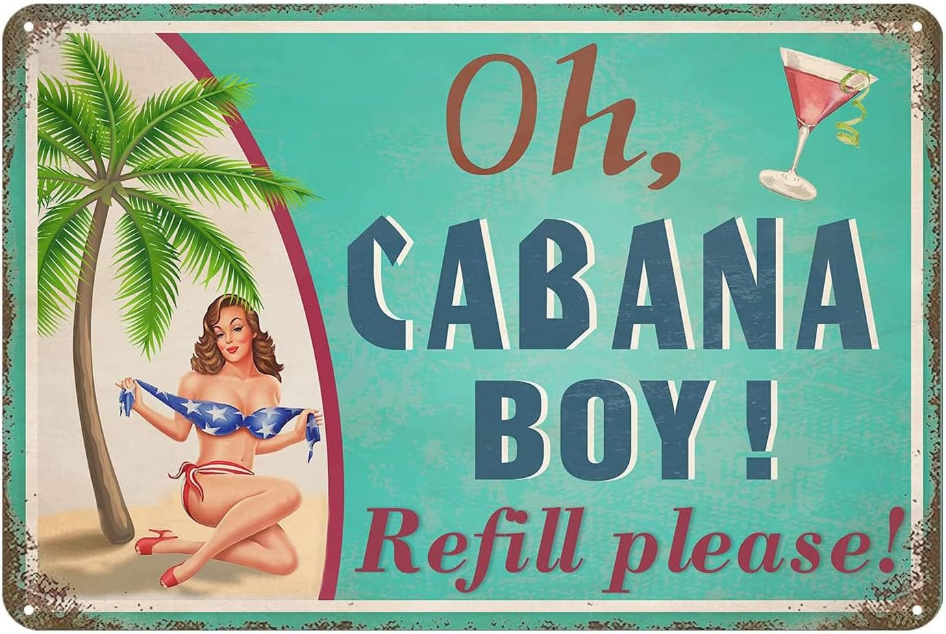 - Characteristic Creativity: The metal tin poster of coconut girl is very suitable for summer and is also the first choice for summer gifts. Oh Cabana Boy Refull please Metal Sign's vibrant color scheme, retro design, and exquisite patterns add a unique and interesting retro style to your walls.