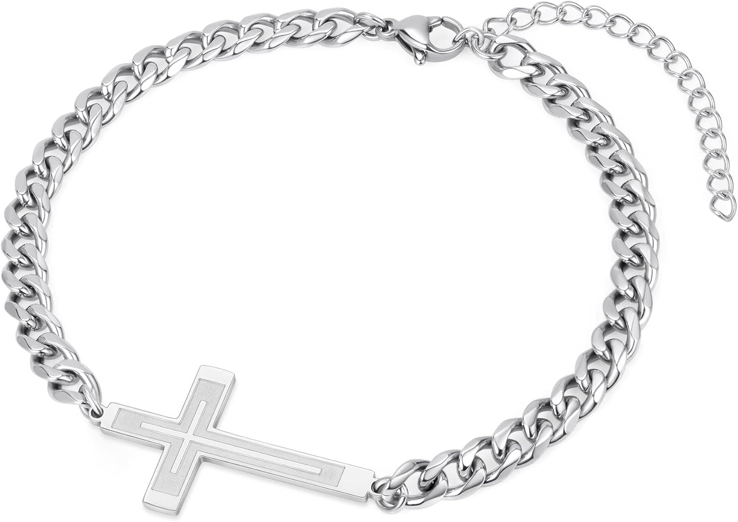 Silver Cross Bracelet for Men Teens, Stainless Steel Cuban/Figaro Cross Chain Link Bracelet 5mm 7+2 Inches, Christian Religious Jesus Confirmation Jewelry Gifts for Him