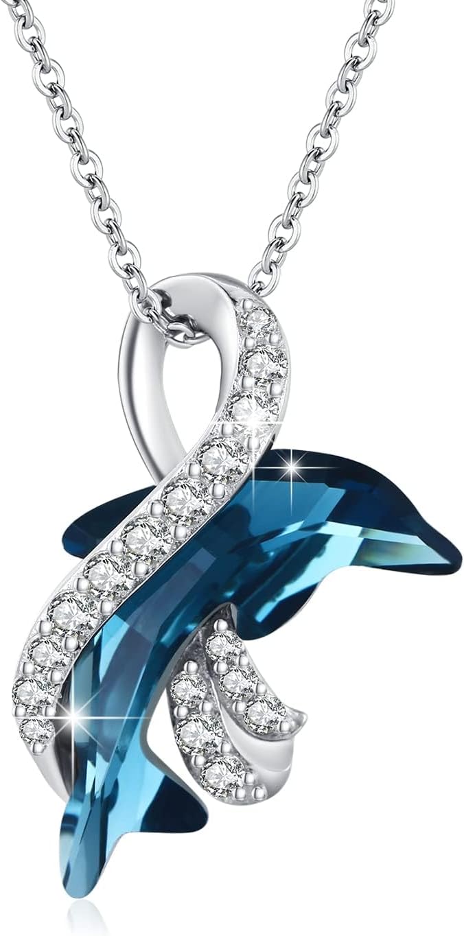 Dolphin Infinity Necklace for Women 925 Sterling Silver Cubic Zircon Blue Crystal Necklace Dolphin Pendant New Year Jewelry Gifts for Family with Cable Chain 18"+2"