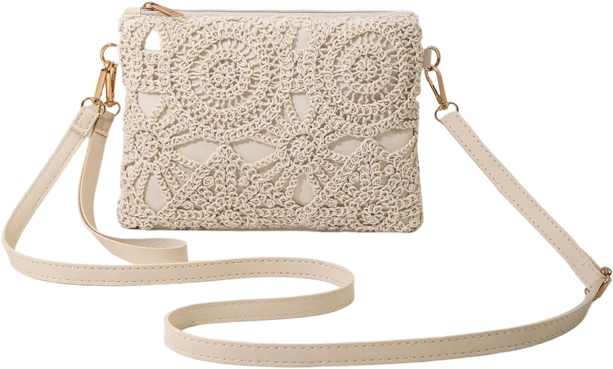 OYOANGLE Women's Boho Crochet Square Purse Beach Vacation Zipper Small Crossbody Handbags with Detachable Strap