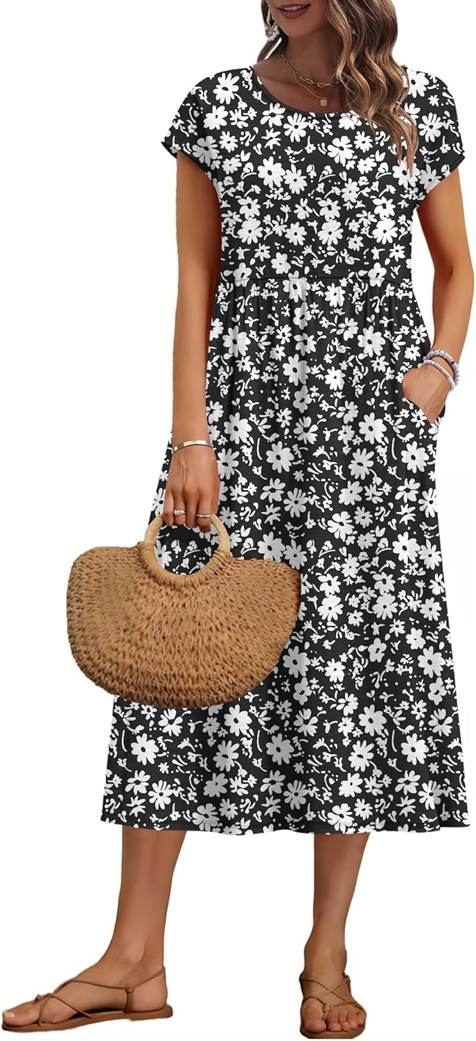 AUSELILY Women's Summer Short Sleeve Midi Dresses Round Neck Loose Dress with Pockets 2026 New