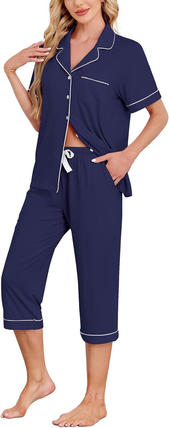 ANLIQI Women's Cotton Pajama Sets Short Sleeve Modal Capri Pjs Button Down Sleepwear for Women Soft & Comfy Lounge Set S-2XL