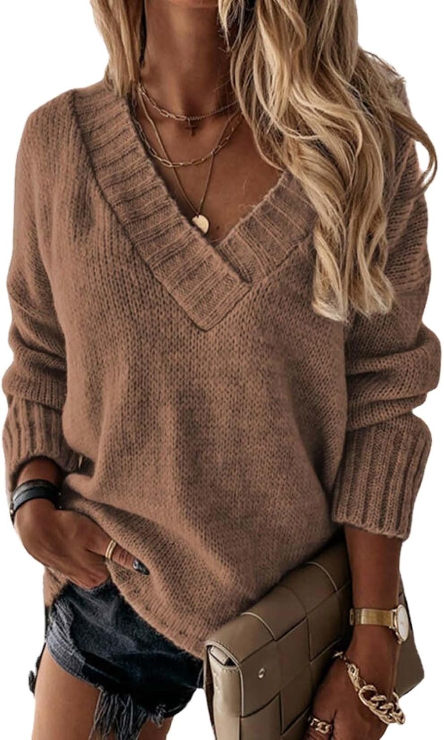 Womens Loose Sweater Sexy V Neck Long Sleeve Solid Color Knit Pullover Sweater Pullover Top