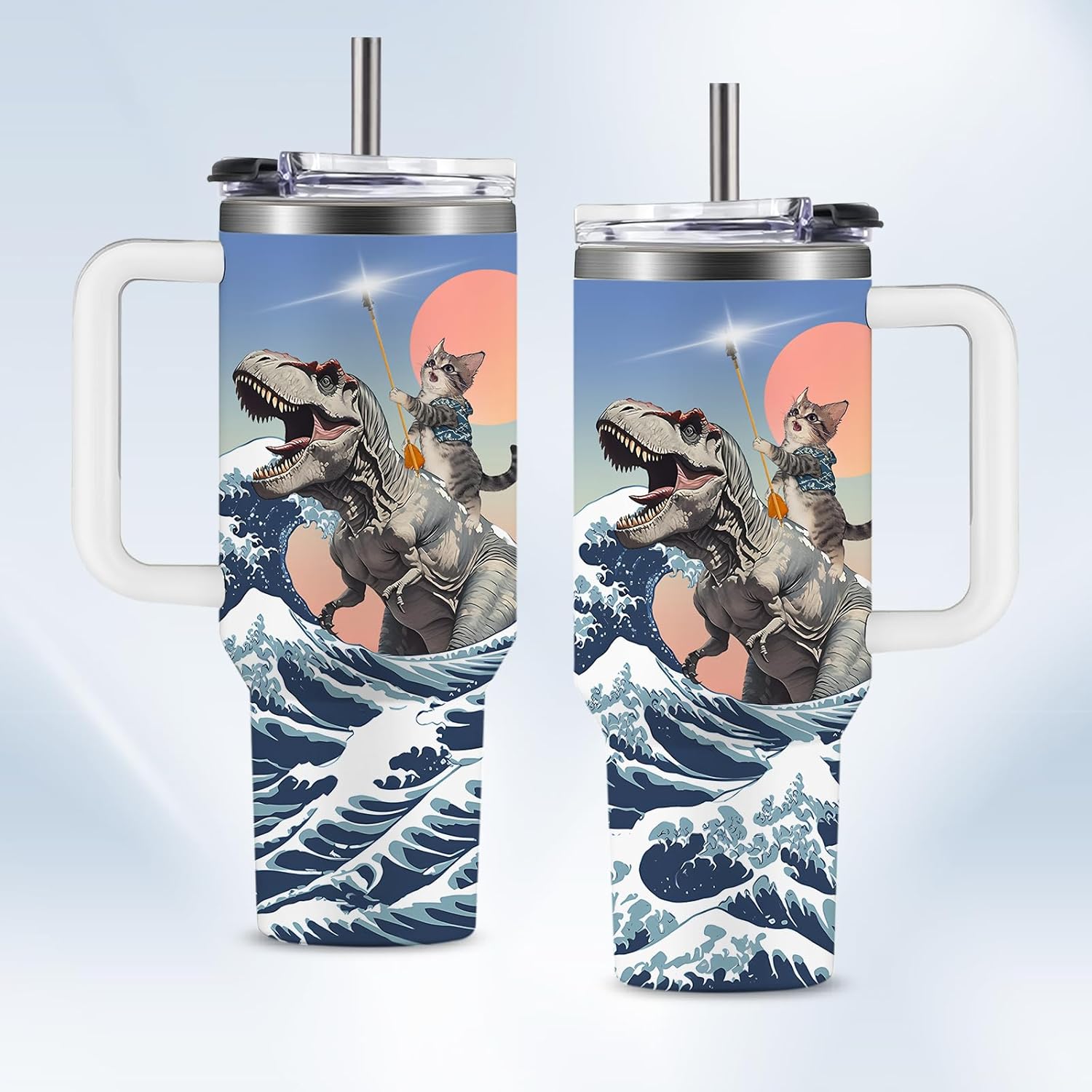 - 【Playful Cat & Dinosaur Art Tumbler】This 40oz stainless steel tumbler features a whimsical cat and dinosaur design, adding a touch of humor to your daily routine. Perfect for fans of quirky and fun drinkware.