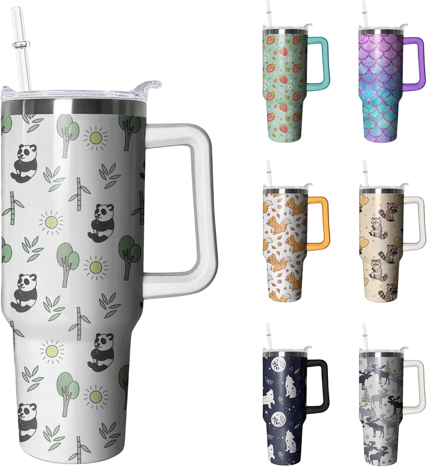 40oz Panda Stainless Steel Tumbler with Handle and Straw, Insulated Cup Travel Coffee Mug Water Bottle with Lid and Straw, Animal Lovers Women Gifts