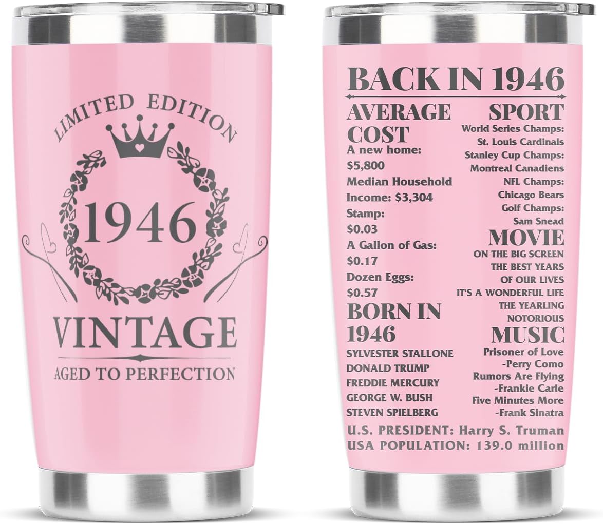 80th Birthday Gift for Women Men,80 Year Old Birthday Gifts for Women,Tumbler 20 oz Stainless Steel Vacuum Insulated Tumblers Womens 80th Birthday Gift Ideas Pink
